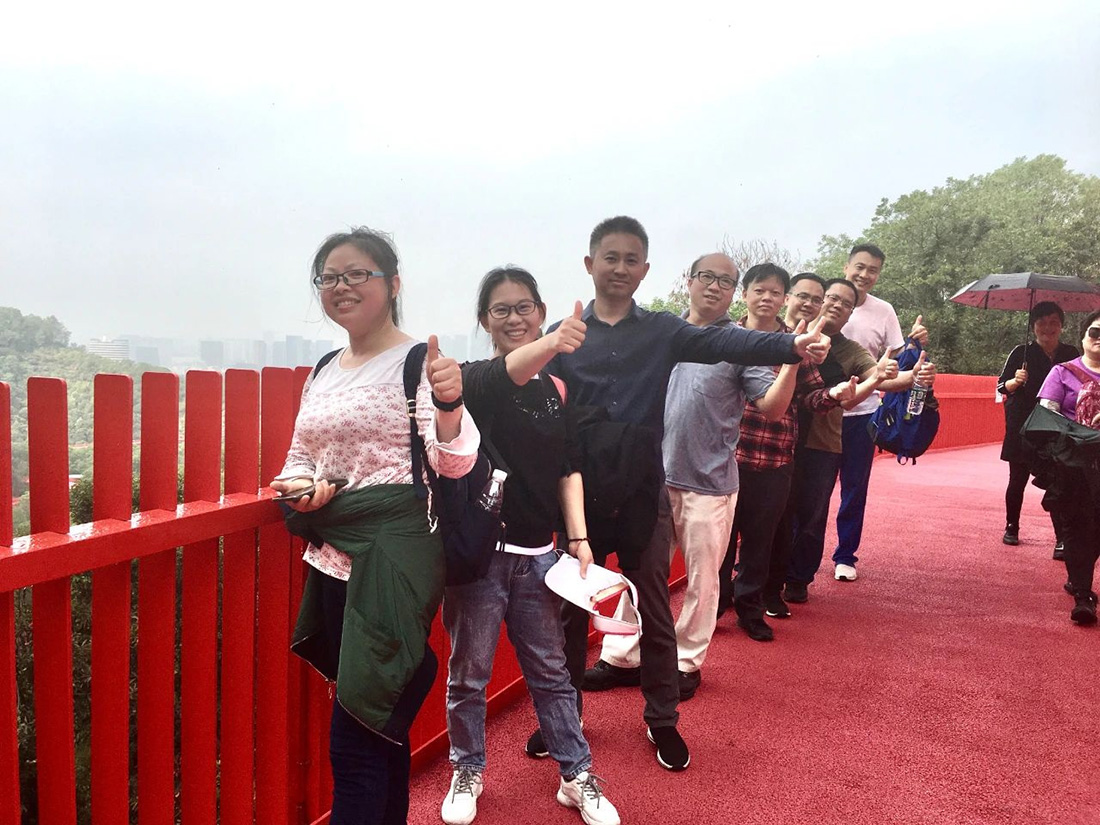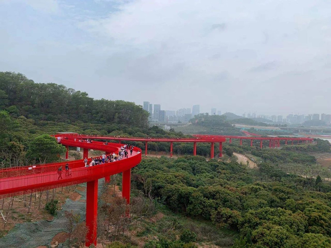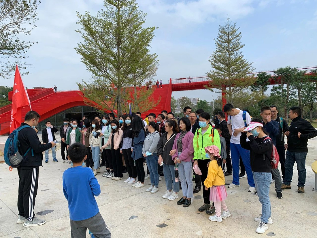 此次拓展活动目的地——深圳虹桥公园,“虹桥”全长4公里,如一条醒目的“红飘带”,飘逸灵动的形态让虹桥成为最受瞩目的新晋网红打卡地。其形态优美、行走舒适,在高低起伏的山体与自然地势间,桥体蜿蜒绕山而上;踏入高峰,城、林、湖全景,繁华都市与生态美景尽收眼底。