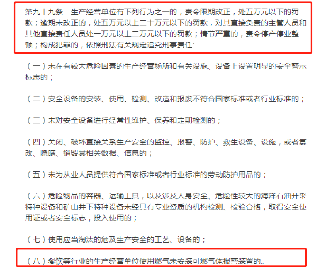 《中华人民共和国安全生产法》第九十九条还规定,餐饮等行业的生产经营单位使用燃气未安装可燃气体报警装置的,将进行相应处罚;情节严重的,责令停产停业整顿;构成犯罪的,依照刑法有关规定追究刑事责任。