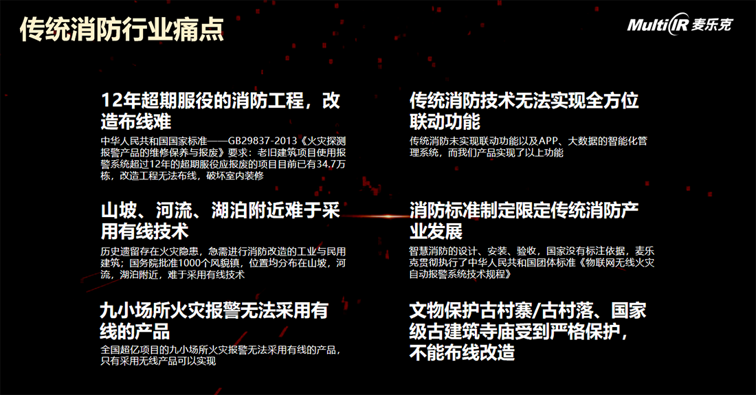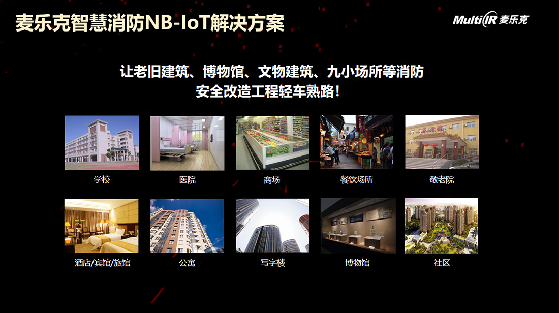 麦乐克新推出的智慧消防NB-IoT解决方案有效解决了传统消防行业的几大痛点:老旧建筑项目使用报警系统超过12年的超期服役应报废的项目;九小场所火灾报警无法采用有线产品;山坡、河流、湖泊附近难于采用有线技术;传统消防技术无法实现全方位联动功能;文物保护古村寨/古村落、国.家级古建筑寺庙受到严格保护,不能布线改造等痛点。
