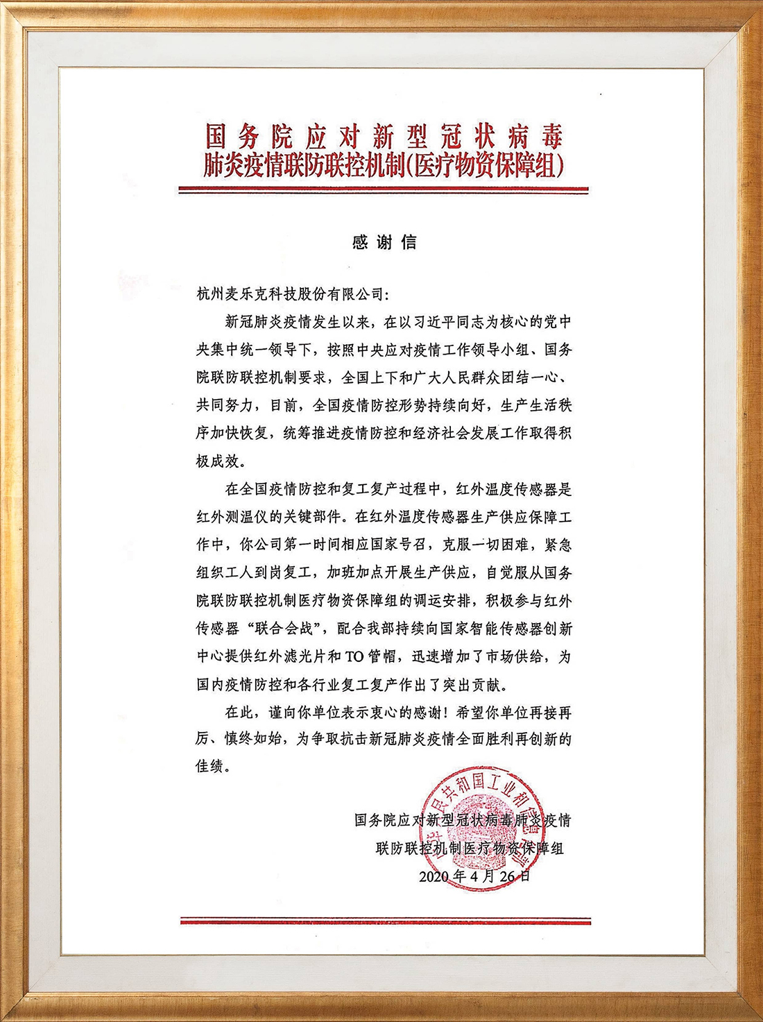 众所周知,红外滤光片、TO管帽、红外测温模组是红外测温仪的核心部件,红外人体测温仪在战“疫”前线发挥着至关重要的作用。2020年麦乐克积极配合国.家防疫部门参与了红外传感器“联合会战”,持续向测温仪产业提供了大量的红外滤光片和TO46管帽,迅速增加了市场上防疫物资/设备的供给能力,为国内疫情防控和各行业复工复产尽献绵薄之力,受到了国务院、浙江省政府的嘉奖。